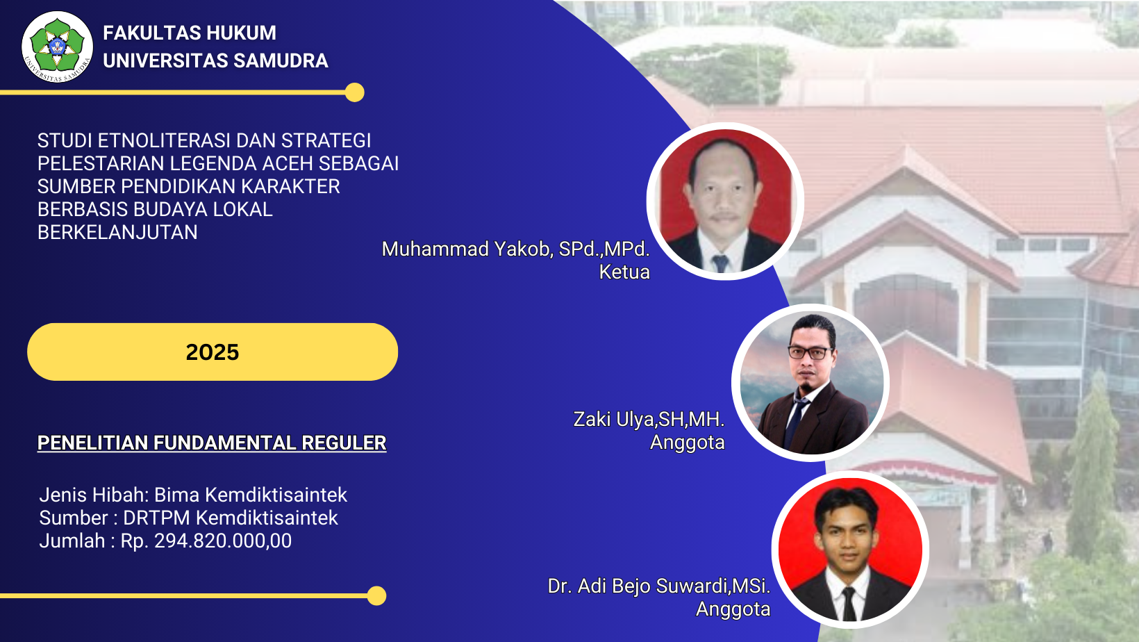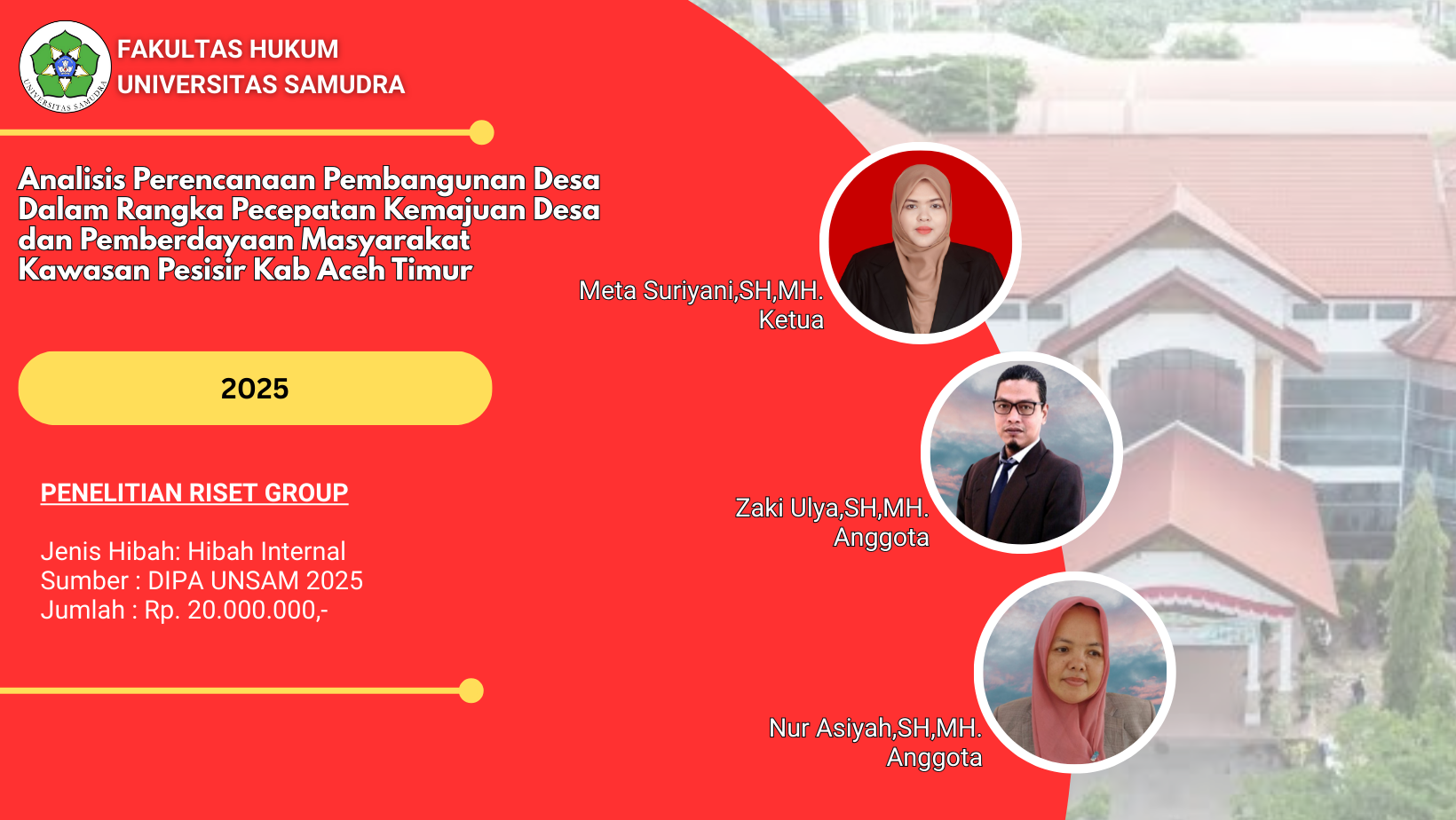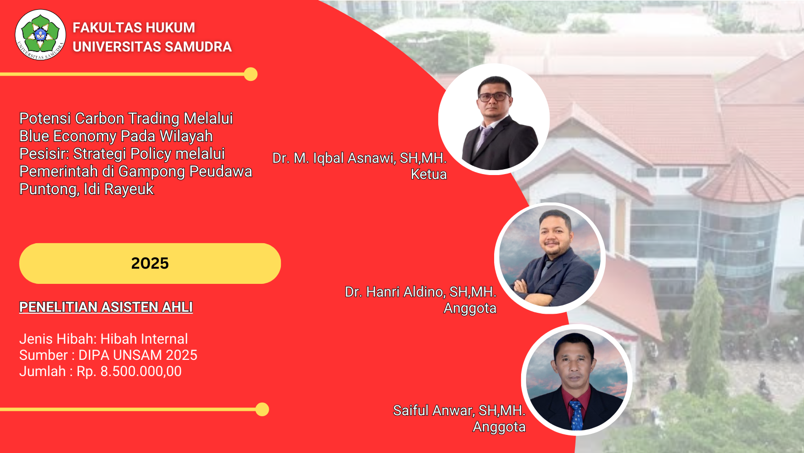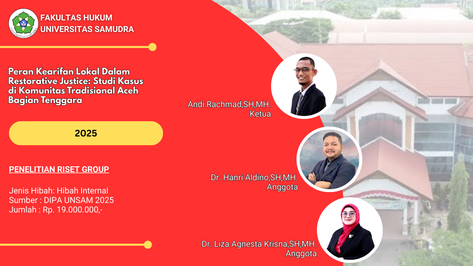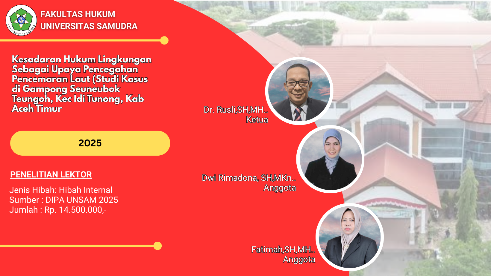 Penelitian Tahun 2025 No.Jenis PenelitianJenis HibahJumlah PenelitianJumlah Anggaran (Rp.) 1Penelitian Lektor KepalaInternal258.000.000,- 2Penelitian LektorInternal457.500.000,- 3Penelitian Riset GroupInternal239.000.000,- 4Penelitian Asisten AhliInternal18.500.000,- 5Penelitian Fundamental RegulerEksternal1294.820.000,- Jumlah412.820.000,- Penelitian Tahun 2024
