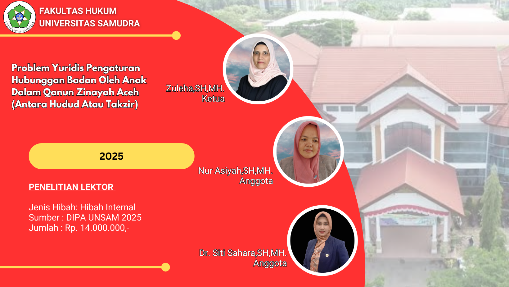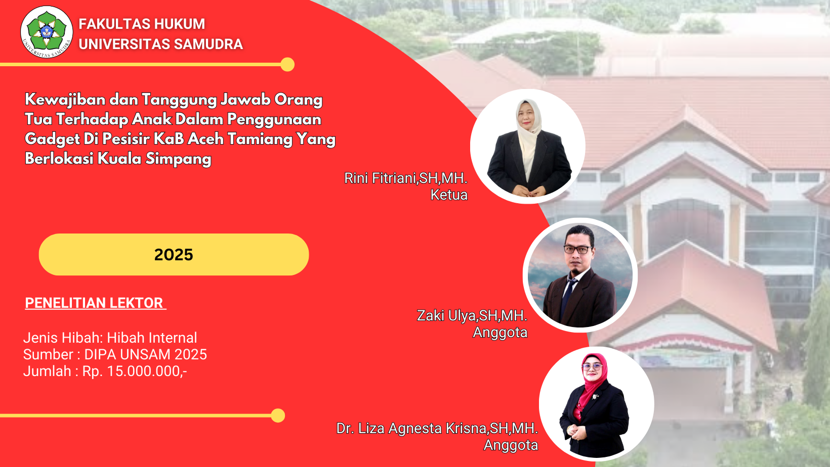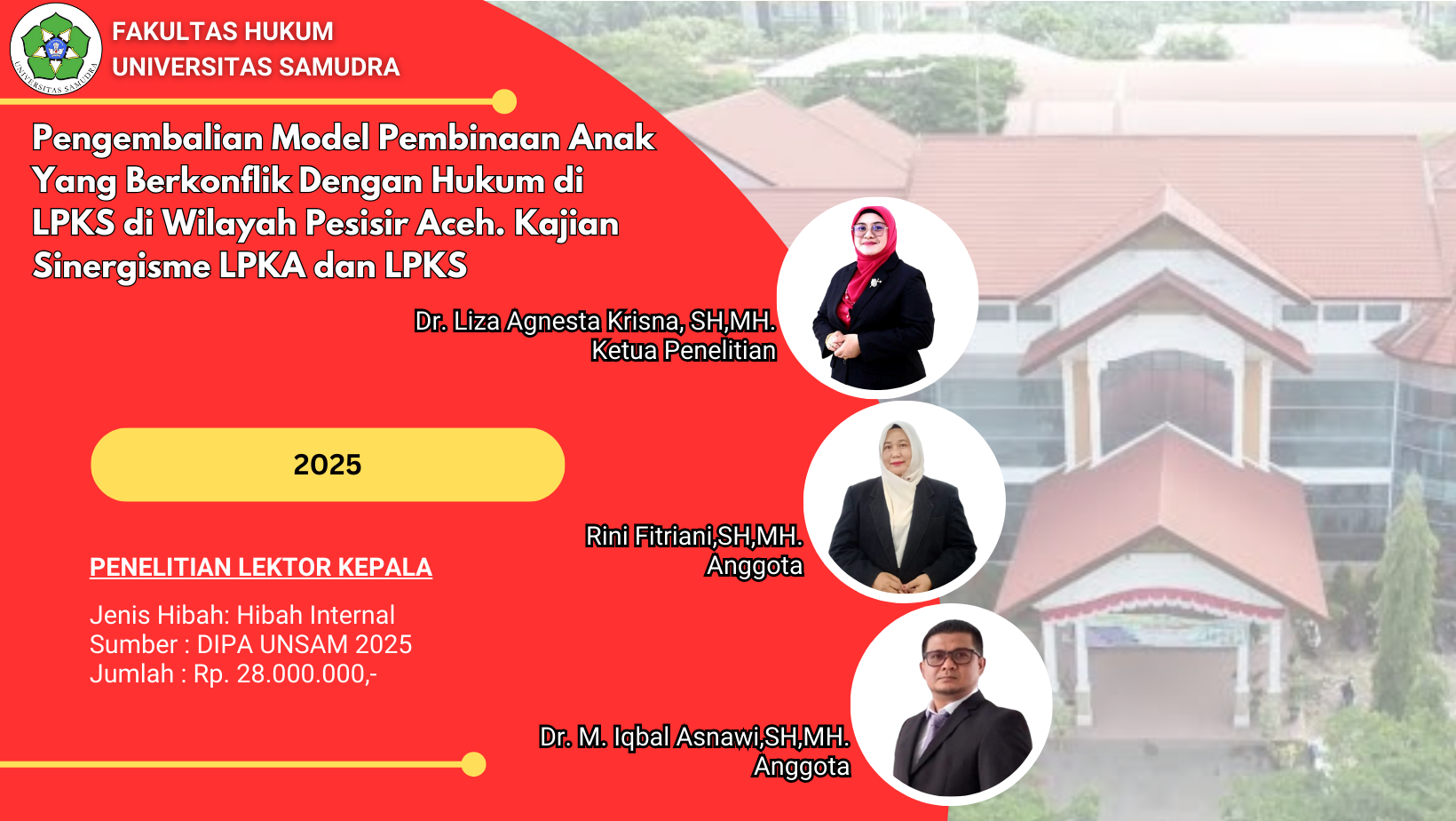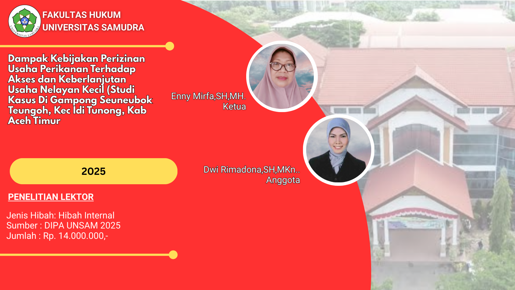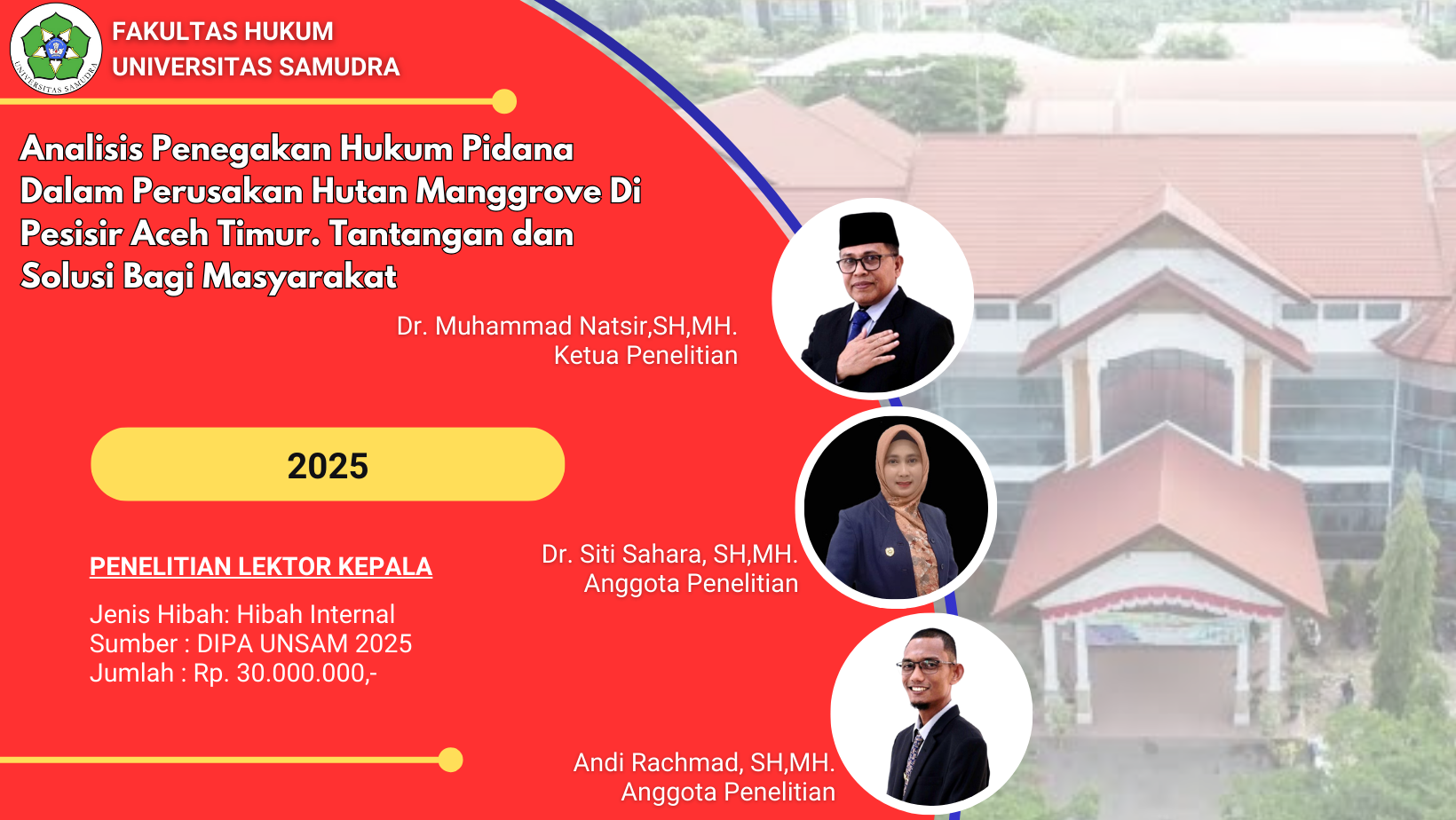 Penelitian Tahun 2025 No.Jenis PenelitianJenis HibahJumlah PenelitianJumlah Anggaran (Rp.) 1Penelitian Lektor KepalaInternal258.000.000,- 2Penelitian LektorInternal457.500.000,- 3Penelitian Riset GroupInternal239.000.000,- 4Penelitian Asisten AhliInternal18.500.000,- 5Penelitian Fundamental RegulerEksternal1294.820.000,- Jumlah412.820.000,- Penelitian Tahun 2024
